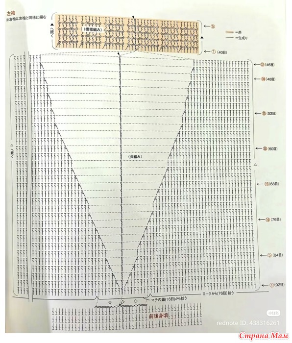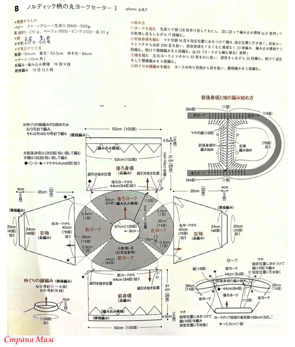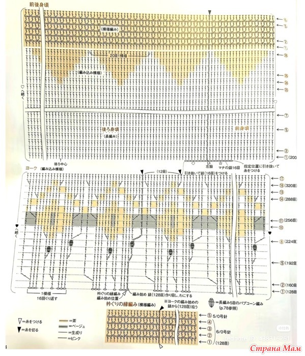 2.Свяжите переднюю и заднюю части изделия. Прикрепите нить в указанном месте и провяжите 16 воздушных петель для клина, затем вытяните ее в указанном месте. Наберите в общей сложности 200 петель с кокетки передней и задней частей изделия и клина, провяжите 23 ряда по периметру передней и задней частей изделия без прибавок и убавок, затем провяжите 5 рядов лицевым узором. Продолжайте вязать 6 рядов узорчатым вязанием. (См. стр. 33 (При вязании с кокетки))