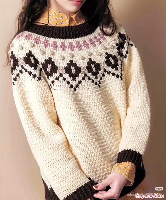 Джемпер скандинавским узором на круглой кокетке. Крючок.