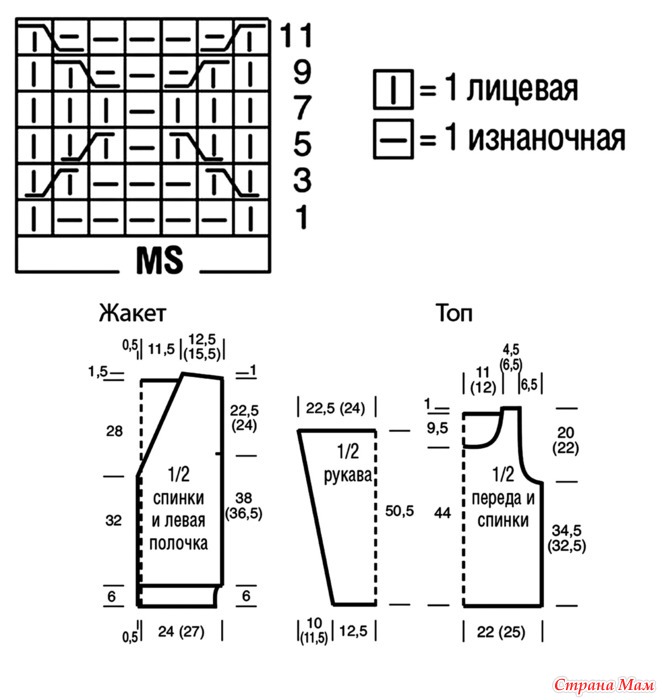 С левого края = последние 2 п. перед кромочной провязать вместе лицевой.