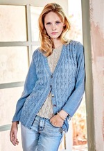 Для вязания нам потребуется 300 (350) г бежево-серой для топа и 600 (650) г джинсово-синей для кардигана пряжи: 60% шерсть, 40% полиакрил; 120 м/50 г.
