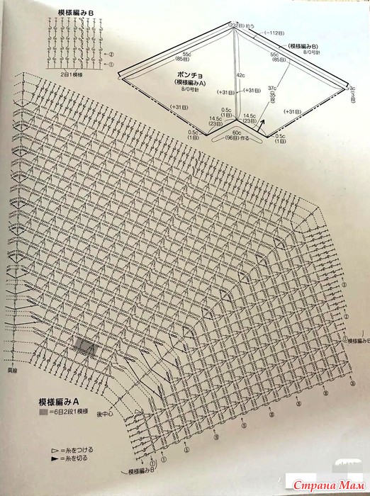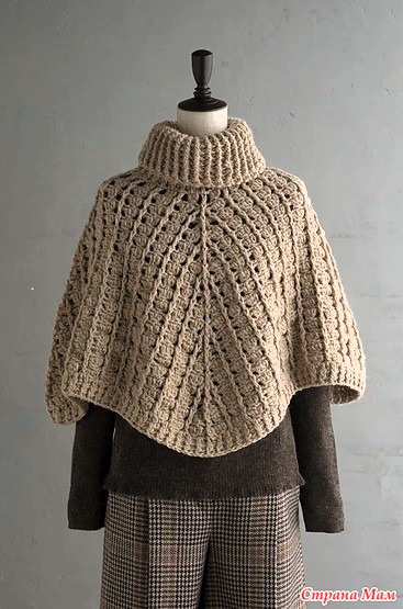 Узорчатые петли... Чтобы вытянуть столбик с накидом узорчатой ;петлей А, поднимите штанину столбика с накидом из предпоследнего ряда. Пончо... Наберите цепочку и сделайте петлю, затем поднимите изнаночную сторону цепочки и провяжите узорчатыми петлями. Прибавьте петли в четырех местах: по центру передней и задней части и вдоль линии плеча, и продолжайте вязать до узорчатой ;петли В по низу. Для воротника поднимите петли с набора и провяжите узорчатой ​​петлей В до 9-го ряда спицами № 8/0, затем перейдите на спицы № 10/0 для оставшихся 9 рядов.