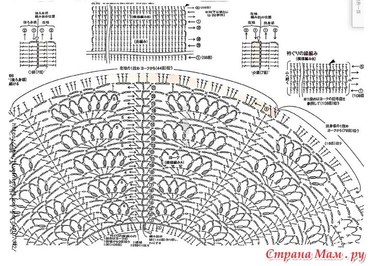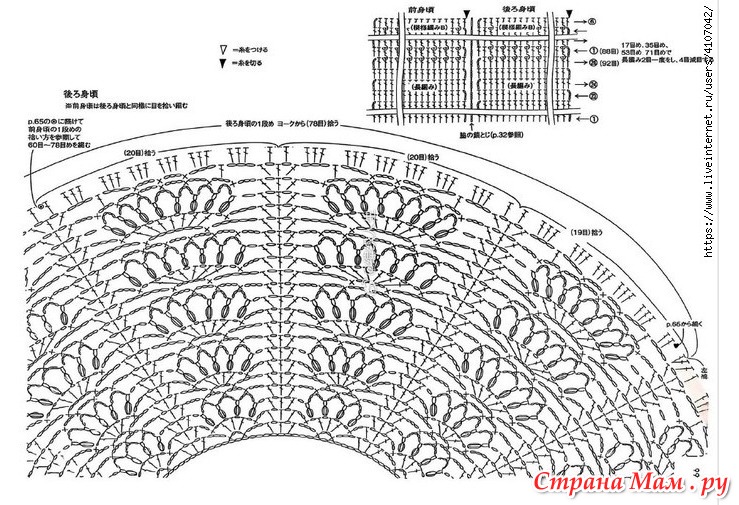 2. Поднимите 7-ю петлю с противоположной стороны клина основной части изделия, 44-ю с указанной позиции кокетки и 7-ю с другого клина, всего 58 петель, 32 столбика с накидом, а затем 4 петли с другого клина.