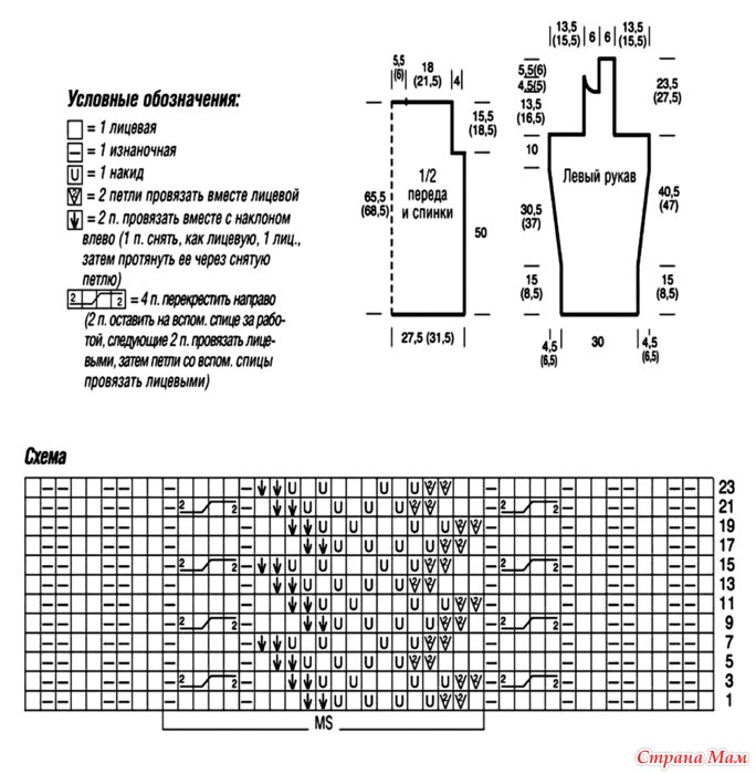 Внимание: участки резинки (= внешние по 9 петель схемы) выполнять только на переде и спинке.