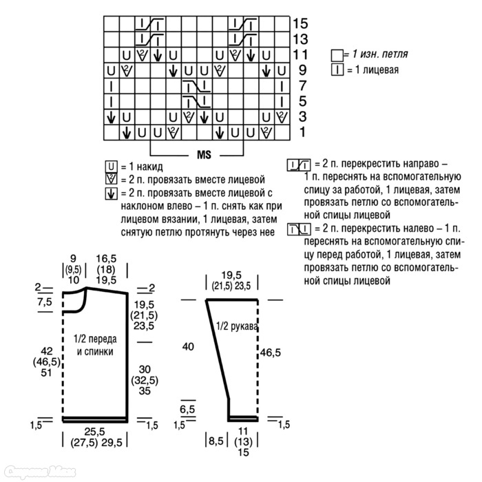 В ширину начинать с кром. и с петель перед раппортом, повторять раппорт, заканчивать петлями после раппорта и кром.