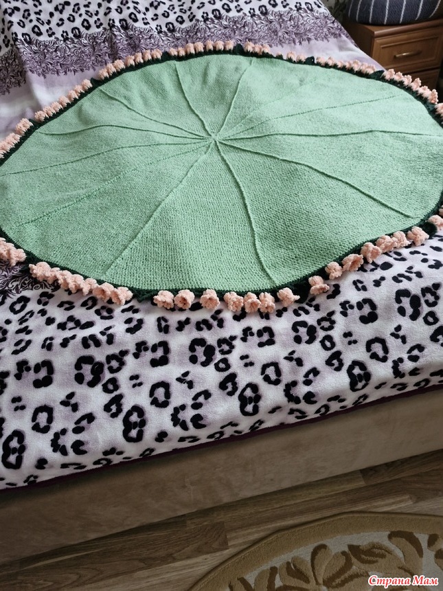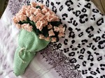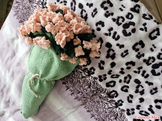 Вот такой получился у меня. Пряжа хлопок-травка с маленьким ворсом . 750м/100г в 2 нити. Крючок 2, 25. Для обвязки и листочков были остатки полушерсти белорусской. Общий вес 550г. Размер полученный 1м45см. По периметру вяжутся либо розочки, либо колокольчики. Вот так красиво смотрится в букете