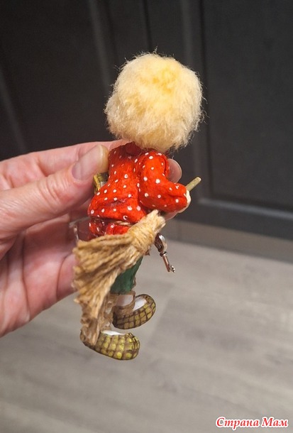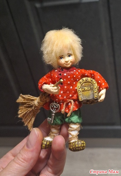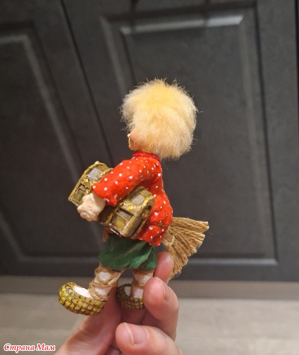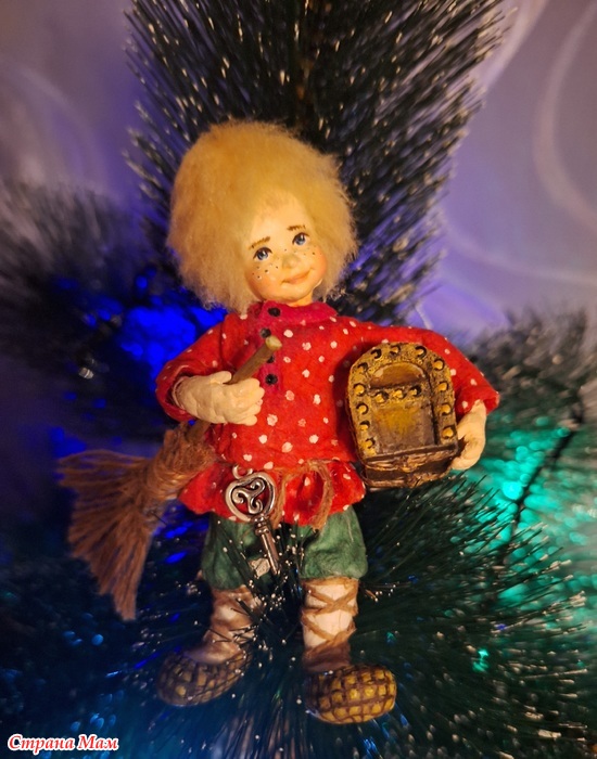 Номер 5 Номинация 4 "Подарок под ёлку", wetka72. Эта игрушка именно под ёлку. Сын купил квартиру и приедет в гости на Новый год. Вот и будет ему подарок со смыслом). Кузенька получился совсем малышок. Чуть меньше 10 см. На проволочном каркасе, как и все мои игрушки. Изготовлен из льняной и хлопковой ваты. Личико традиционно зефирная самозастывающая пластика. Роспись акриловыми красками. Волосы шерсть для валяния. Сундучок из ватного картона и картона обыкновенного. Веник веточка) и джутовая нить. Ну а теперь фотографии.