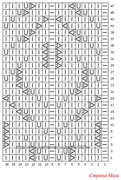 Вязать по схеме. На схеме обозначены только лицевые ряды, в изнаночных рядах петли вязать по рисунку, накиды провязывать изнаночными