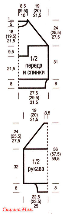 Одновременно через 23 см = 62 р. (24,5 см = 66 р.) 26,5 см = 72 р. от начала выполнения регланных скосов закрыть для горловины средние 20 (22) 24 п. и обе стороны закончить раздельно.