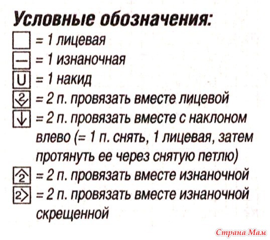 Подчеркнутые убавки: с правого края = кромочная, 2 п. провязать вместе с наклоном влево (= 1 п. снять, как лицевую, 1 лицевая, затем протянуть ее через снятую петлю). С левого края = вязать согласно узору до последних 3 п., затем 2 п. провязать вместе лицевой, кромочная.