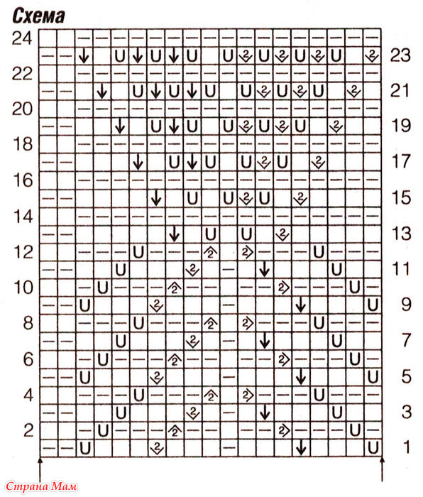 Узор 3: ажурный узор (число петель кратно 19 + 17 п.) = вязать согласно схеме. На ней даны лицевые и изнаночные ряды. Постоянно повторять раппорт из 19 п. между стрелками и закончить первыми 17 п. раппорта.