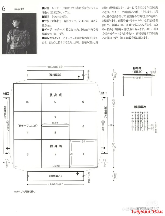 Провяжите 2 петли лицевыми в 4 узорах. Провяжите ряды со 2 по 12, как показано на схеме, получив 8 деталей. Наберите воздушную петлю для полу фигуры. В первом ряду поднимите заднюю часть воздушной петли и провяжите 9 рядов по кругу, как показано на схеме, получив 2 детали. Передняя и задняя части изделия = Обратитесь к схеме, чтобы соединить мотивы, и провяжите 1 столбик без накида и 1 воздушную петлю для соединения. Завершение = Провяжите 1 ряд столбиков без накида по кругу для воротника. Для манжет и низа наберите петли с мотива на основной части изделия и продолжайте вязать переднюю и заднюю части по узору, провяжите 12 рядов для низа и 8 рядов для манжет по кругу.