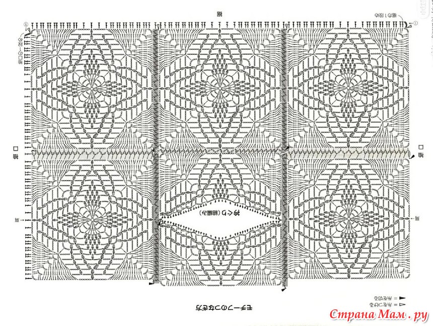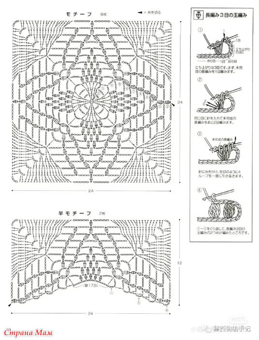 Плотность вязания: Каждый мотив представляет собой квадрат 24 см, узор вяжется за 20 дней по 15 рядов на квадрате 10 см.