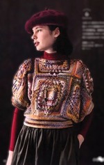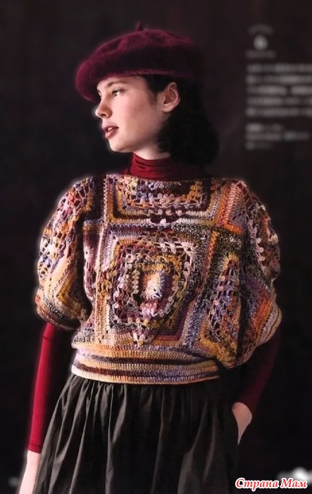 Этот пуловер, связанный из разных мотивов, обладает загадочным шармом благодаря многоцветной градиентной окраске. Основная часть выполнена из восьми больших квадратных мотивов, связанных крючком, а вырезы горловины спереди и сзади — из соединенных между собой bpполу мотивов.