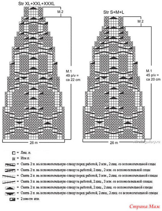 Узоры: см. схемы M.1 и M.2 для вашего размера. Узор на схеме показан с лицевой стороны (все ряды, и четные и нечетные).
