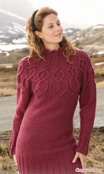 Вязаная туника-реглан с узорной кокеткой. Спицы.
