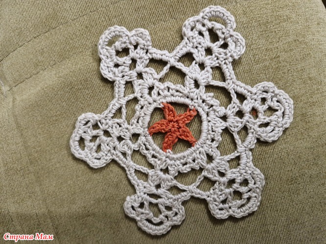 и потеряла покой. Пожалуйста, если у кого есть схема именно такой снежинки или может быть просто кто-то знает как вязать, прошу отзовитесь. Поиск выводит на ФБ, но там дана неверная ссылка. Особенно заинтересовала серединка-звёздочка, ну и собственно сама снежинка. Буду очень благодарна за помощь.