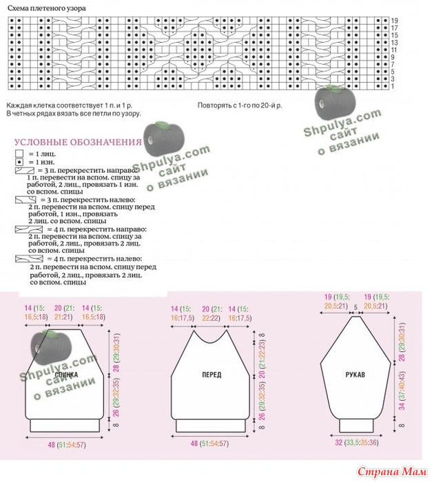 Размер 48: в каждом 4-м р. * 1 х 2 п., 1 х 1 п.*, повторить от* до* еще 6 раз, 1 х 2 п., затем в каждом 2-м р. 2 х 2 п.