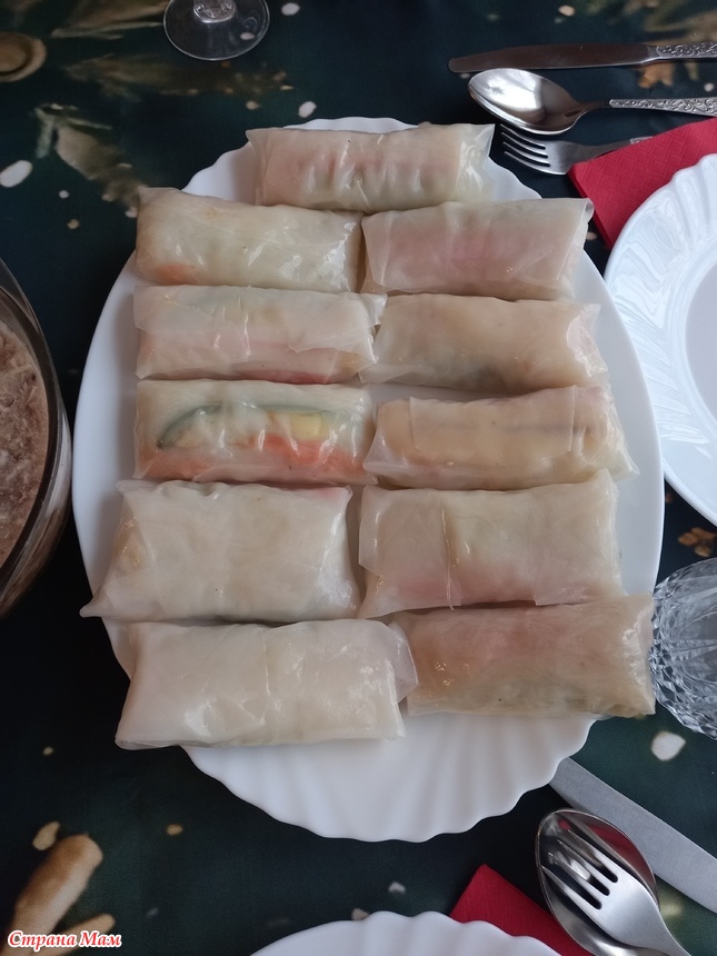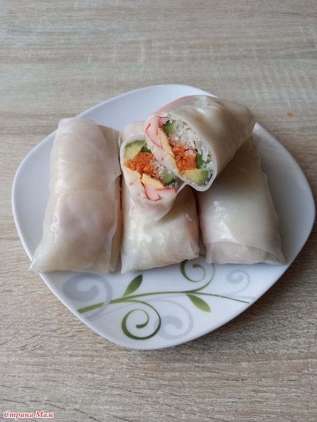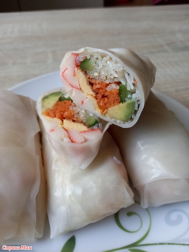 Не знаю почему, но в голове сидит фраза, что "надо натягивать сильнее рисовый лист". Насмотришься кулинарных битв, потом в голове каша. Так несколько роллов я хорошо натянула. И это было зря.