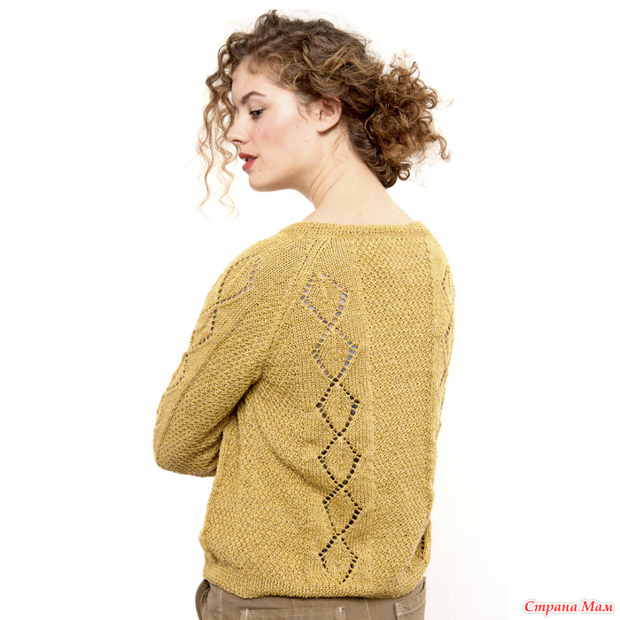 Регланные скосы. Через 33 (34:34:35:36) см = 94 (96:96:98:102) р. от начального ряда закрыть для пройм с обеих сторон 2 (4:5:9:12) п., затем убавить для регланных скосов на расстоянии 2 п. от края в каждом следующем 2-м р. 31 (33:36:37:38) х 1 п. Одновременно через 51 (51:51:51:59) см = 144 (144:144:144:166) р. от начального ряда после 22-го р. схемы ажурного узора продолжить вязать петли ажурного узора лицевой гладью. После последней регланной убавки вязать 1 р. на оставшихся 41 (43:45:47:51) п. и закрыть петли для горловины.