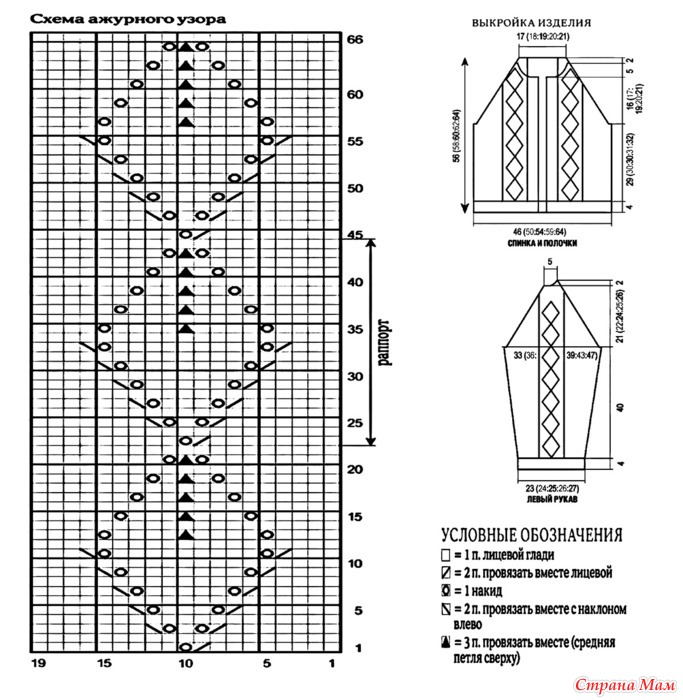 Ажурный узор (на 19 п.). Вязать по схеме. Во всех четных рядах вязать все петли изнаночными. 23-й р.: повторять, начиная с 1-го р.
