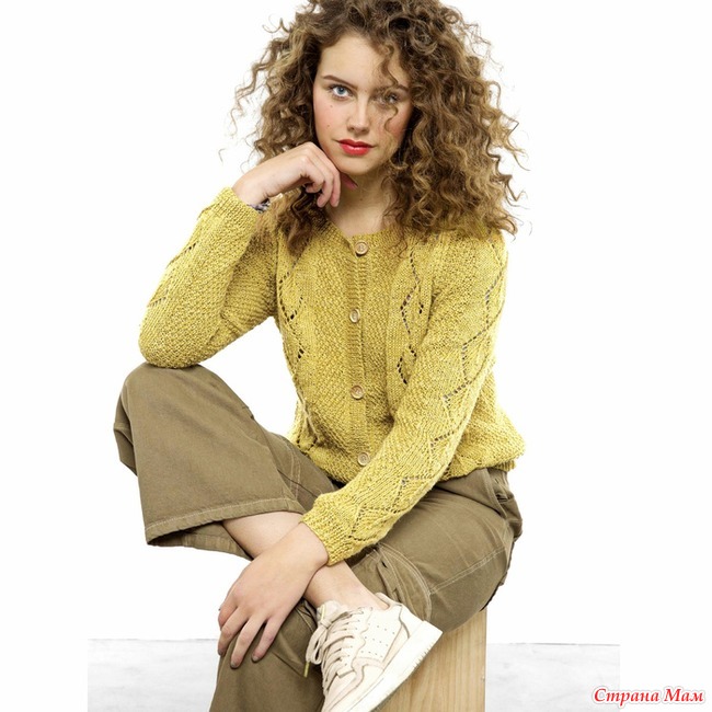 Для вязания нам потребуется 9 (10:10:12:12) мотков горчично-желтой пряжи: 50% мериносовая шерсть, 50% лён; 125 м/50 г. Спицы № 3,5 и 4. А также 5 пуговиц диаметром 22 мм.