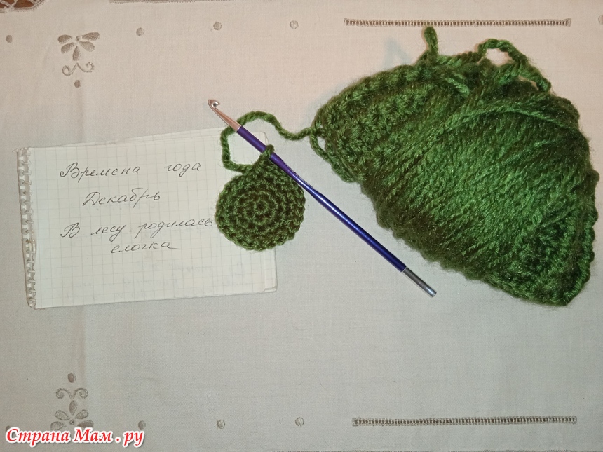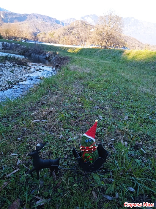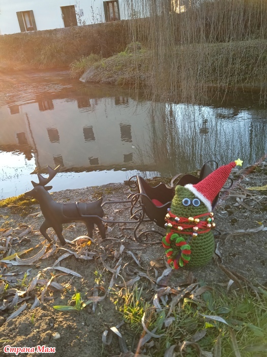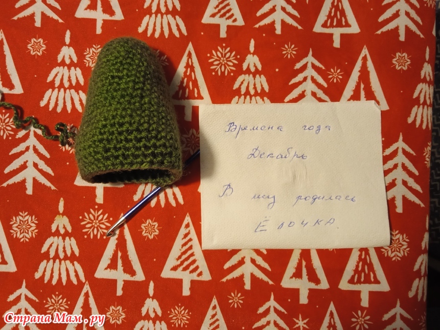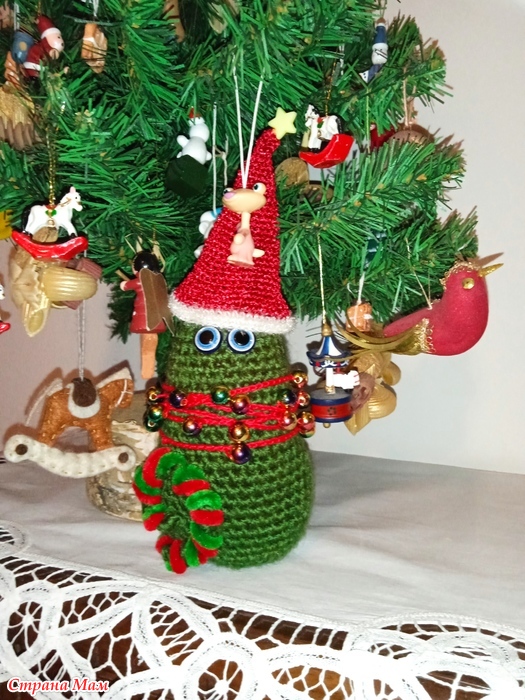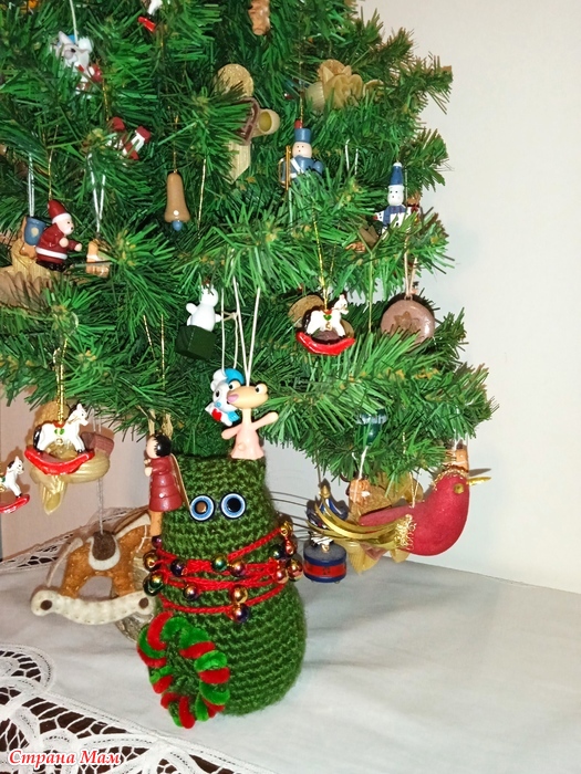 Ёлочка-кот связана из акриловой пряжи. Размер игрушки 13 см.