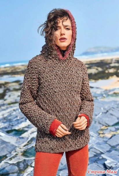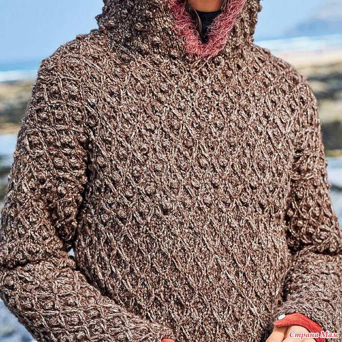 Меланжевый пуловер с капюшоном и узором «шишечки». Спицы.