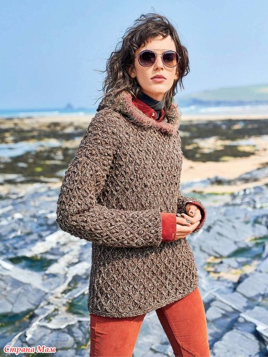 Плотность вязания: 19 п. х 27 р. = 10 x 10 см, связано узорами из ромбов; 16 п. х 25 р. = 10 x 10 см, узором из «шишечек».
