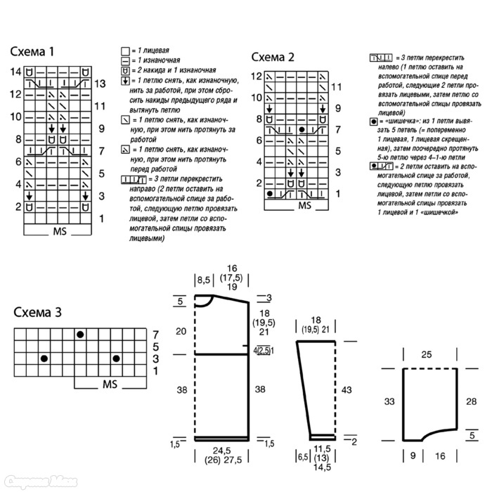 Узор из «шишечек». Число петель кратно 6 + 5 + 2 кромочные = вязать согл. схеме 3. На ней даны лицевые ряды.
