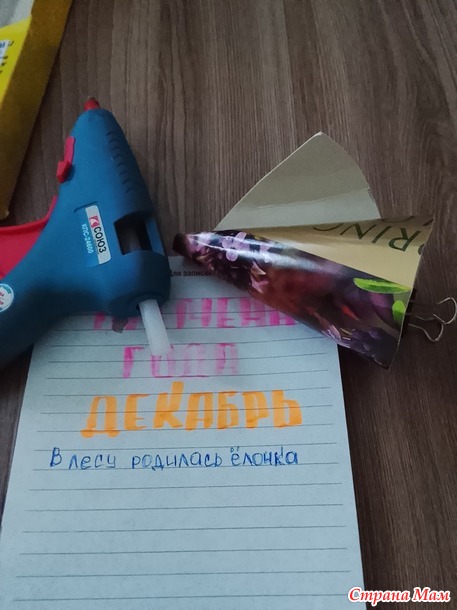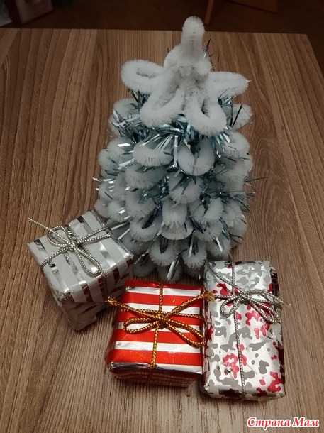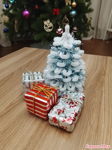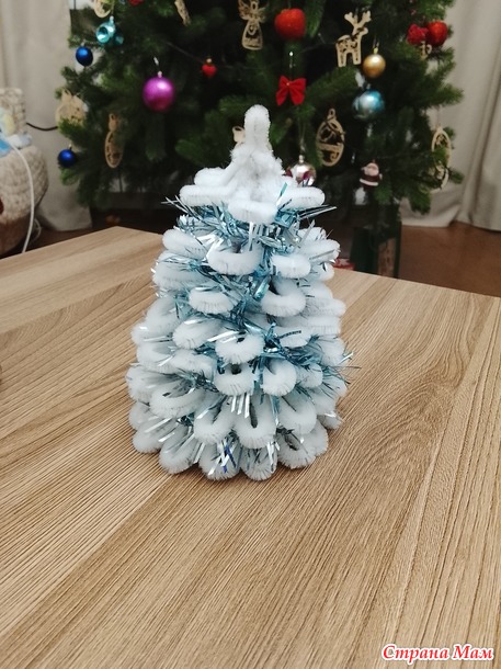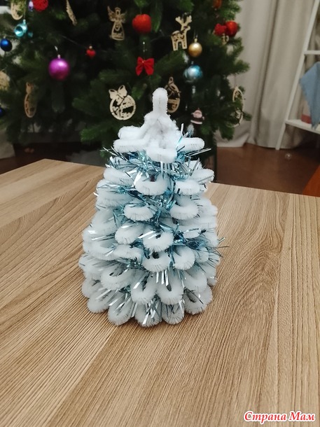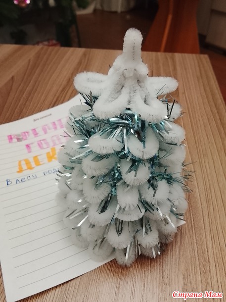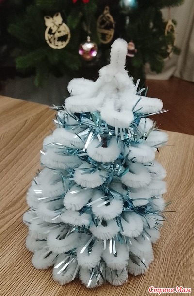 Добрый вечер! Мой отчёт за декабрь. Снежная ёлочка. Долго не получалось начать работу над ёлочкой, и вот в предпоследний день старого года всё отложила. Моя заявка - ёлочка. Долго не могла понять что и как начать, вспомнила что есть остатки синельной проволоки, нашла МК в свободном доступе и вперёд. Мои материалы: картон от коробки чая, синельная проволока, клеевой пистолет.