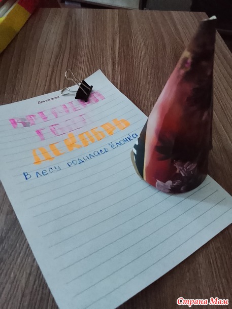 . Проволоки оказалось маловато, картон просвечивал, ёлочка какая-то куцая получилась. Залезла в коробку со старой новогодней мишурой и о чудо, нашла кусок зелёной мишуры. Обмотала просвечивающиеся места. И ёлочка преобразилась! Получилась заснеженная ёлочка.На этом заканчиваю свой отчёт, о том на сколько всё получилось судить вам, это же конкурс. Этой ёлочкой я осталась довольна. Я думаю у многих такая ситуация, что в наших мыслях мы рисуем одно, а по факту дорисовываем другое. Спасибо!