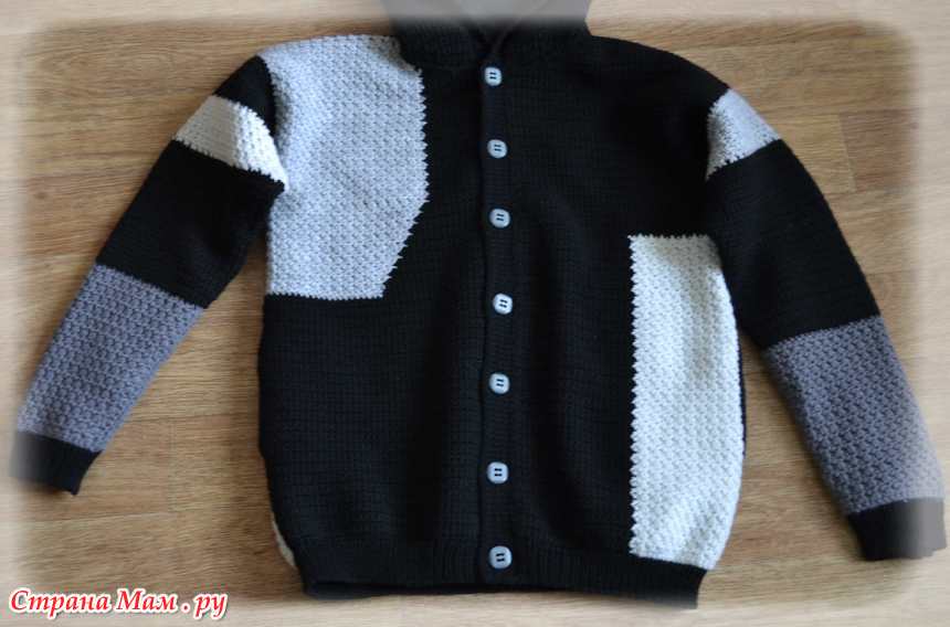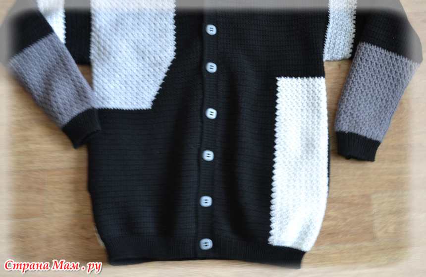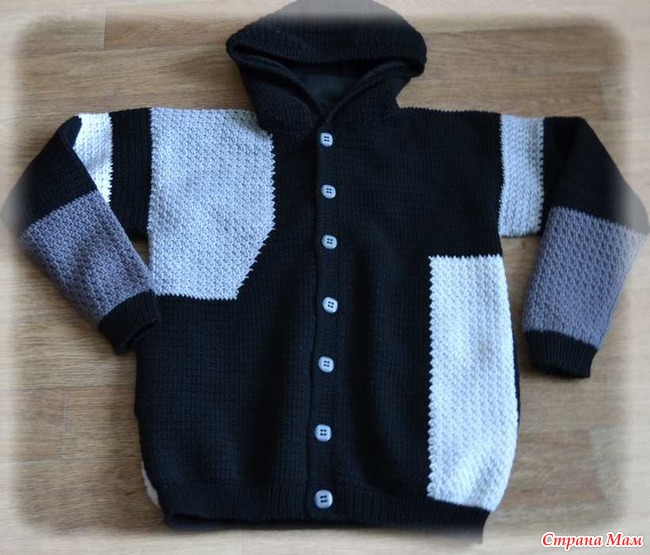 Недавно показывала кардиган для внучки, связанный квадратами. Внуку понравился и попросил связать ему тоже, но только чтобы был с ассиметричным рисунком. История повторилась - сам нашел картинку в интернете и сказал, что хочет что то подобное. Работа началась с рисования эскиза, определения цветов и в результате родилась такая курточка.