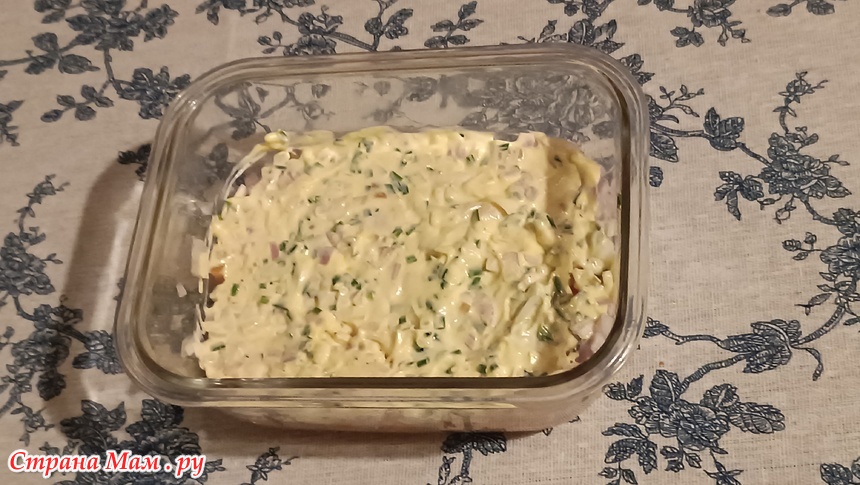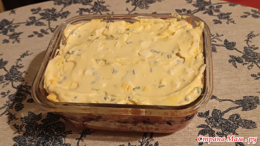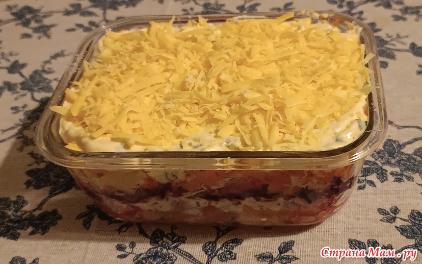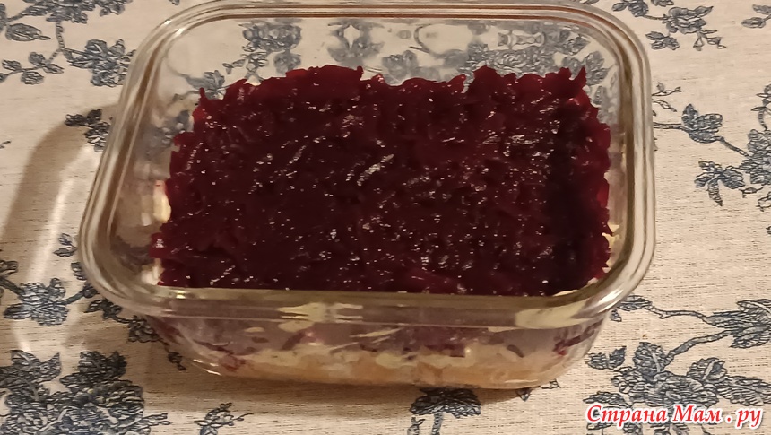 Да, и вместо тривиального майонеза используется соус из майонеза, греческого йогурта и зеленого лука. У меня майонез был домашний. Еще необычно то, что в натерную свеклу добавляют яблочный (у меня рисовый) уксус и мед. Дают настояться, пока занимаются другими ингридиентами.