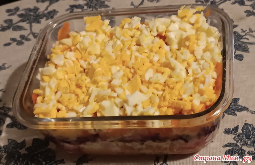 Дальше без соуса картофель, морковь и яйца. В отличие от овощей, яйца рубят, а не трут на терке.