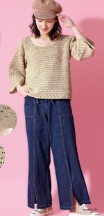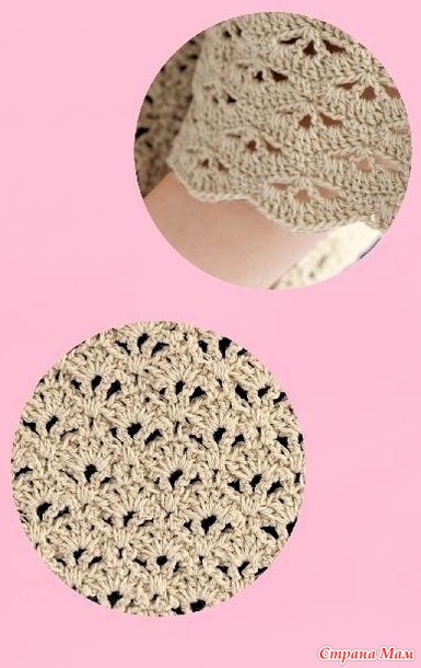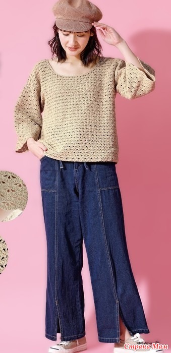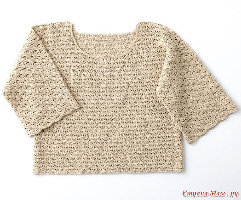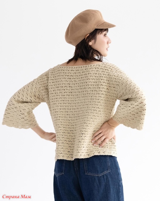 Это вязаное крючком изделие отличается различными узорами на основной части и рукавах. Широкий вырез горловины создает женственный силуэт в области декольте, а свободные рукава три четверти обеспечивают комфорт. Натуральный бежевый цвет универсален и подчеркивает утонченный шарм утонченной взрослой женщины. Рукава вяжутся с лицевой стороны, а манжеты имеют фестончатый узор.