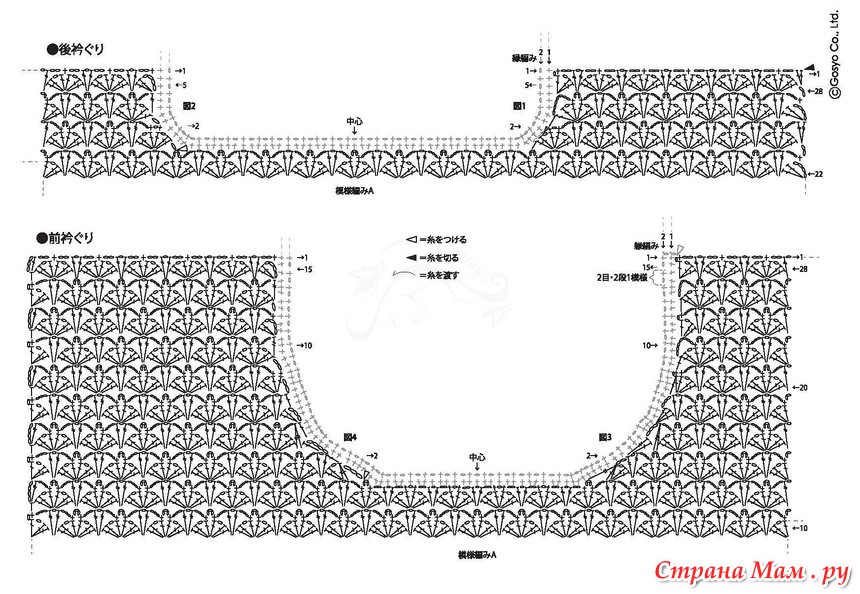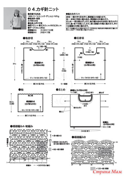 Рукава: Начните вязать так же, как и основную часть изделия, затем провяжите узор B. Завершение: Провяжите воздушную петлю на плечах. Оберните начало рукава вокруг основной части изделия и пришейте. Провяжите воздушную петлю по бокам и под рукавами. Провяжите столбик без накида по кругу по низу изделия. Провяжите кайму по кругу у воротника.