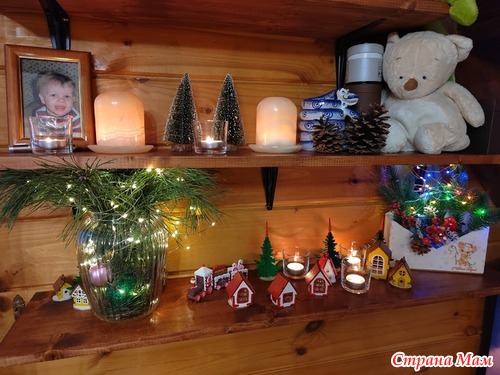 И рождественская деревня на прикроватном столике в спальне. Игрушки вяжет моя подруга