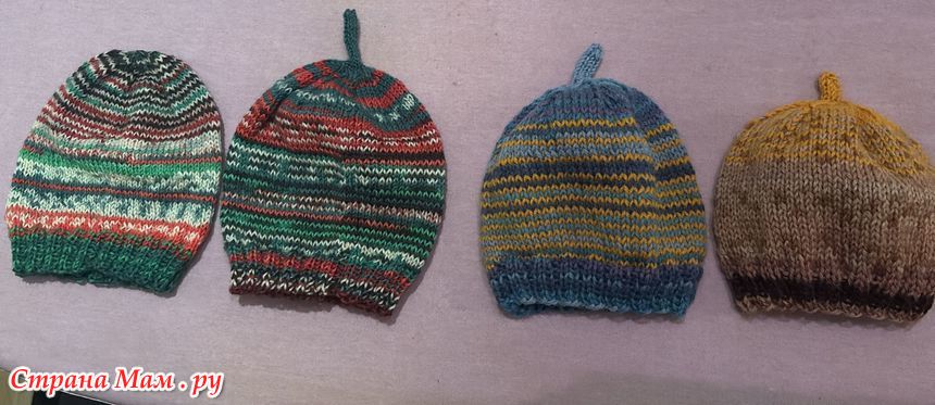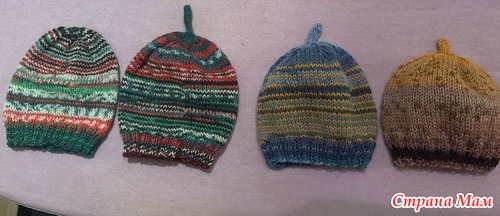 Вот эти шапочки уже давно были связаны из остатков, но надо связать еще хотя бы дюжину для отправки в роддом