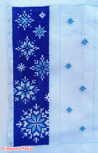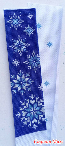 Я начала вышивать закладку Зимние узоры. Вышивается на белой канве, а потом фон зашивается чёрными нитками. Но я, скорее всего, буду зашивать тёмно-синими