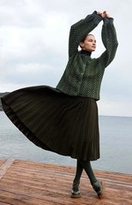 Левая передняя часть (включая воротник): Свяжите 60 столбиков без накида крючком № 8 и сосновой иглой. Продолжайте вязать по схеме II. Закончите через 5 рядов. Правая передняя часть: Свяжите так же, как левый воротник, но в 3-м ряду сделайте 5 равномерно расположенных петель для пуговиц: провяжите 3 петли снизу, 21 петлю и пропустите следующие 2 петли из предыдущего ряда. Повторяйте эту петлю для пуговицы через каждые 11 петель еще 4 раза. Вяжите ряд до конца. Закончите через 5 рядов. Вшейте рукава и пришейте пуговицы.