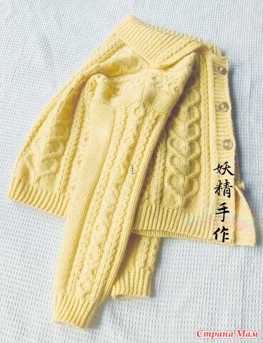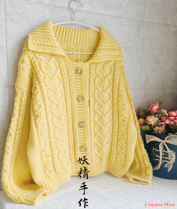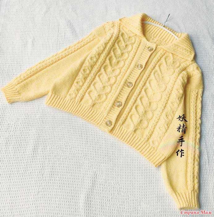Кардиган French kiss в стиле ретро с ярко-желтым узором "Косичка" и сердечками. Спицы.