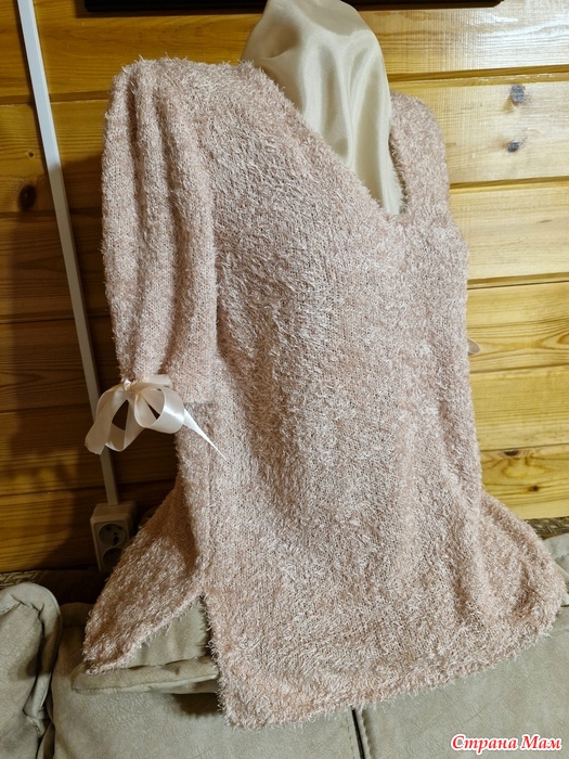 Всем доброго времени суток. Связала для невестки джемпер из натурального итальянского шелка "травка". Метраж 600м/100г. размер 46 со свободой облегания 10см. Красивый пудровый цвет, но фото не передает.