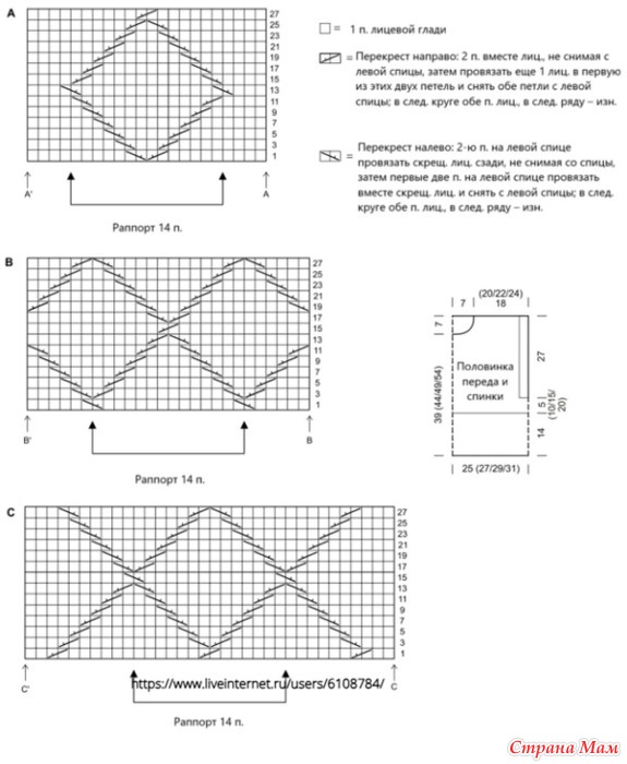 • Узор «Ромбы» в прямых рядах: В зависимости от размера работать по схеме B или C. На схемах изображены только лицевые ряды. В изнаночных рядах все петли вязать изн. Распределение петель описано в инструкции. Повторять ряды с 1-го по 28-й.