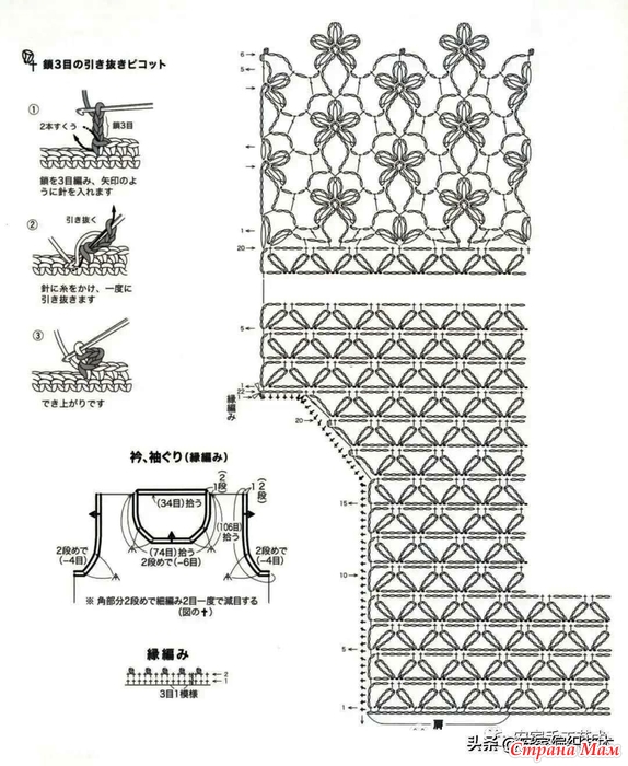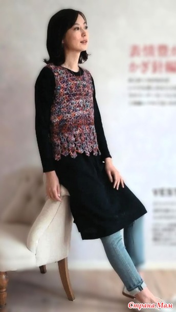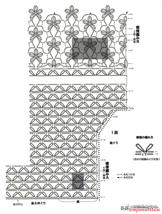 Начните вязание, набрав петли, затем свяжите проймы узорными петлями, как показано на рисунке 1, и переключитесь на узорную петлю B для низа. Провяжите обе узорные петли A и B так, чтобы количество воздушных петель было одинаковым. Для передней части изделия наберите петли с плеча сзади, провяжите 13 рядов на лицевой стороне, как показано на рисунке 2, обрежьте нить и продолжайте вязать лицевой стороной на 14-м ряду на левой стороне. Сшейте воздушную петлю по бокам с помощью вытягивающей петли, а воротник и проймы свяжите круговой каймой, но на углах вяжите один раз в два дня во втором ряду, чтобы убавить петли.