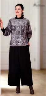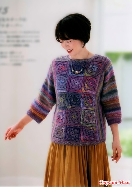 Пуловер из секционной пряжи с цельнокроенными рукавами перед которого выполнен крючком из мотивов а рукава и спинка спицами.