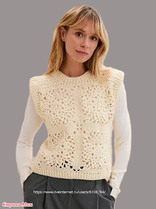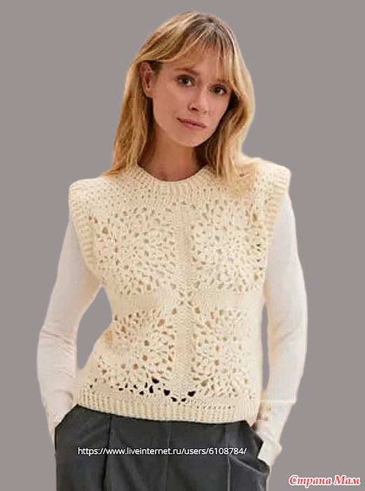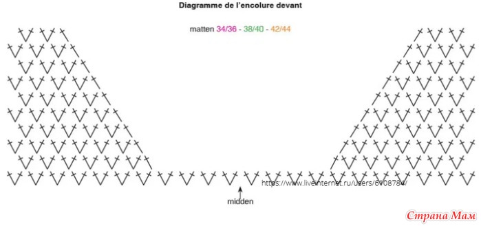 2. Верх переда и горловина: Крючком №4 вяжите фантазийным узором (см. схему) по мотивам и связанным боковым частям. Начинайте со следующего ряда схемы: 1-й - 1-й - 2-й - 2-й - 1-й ряд.