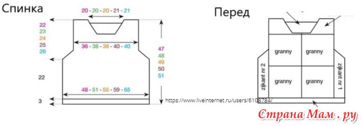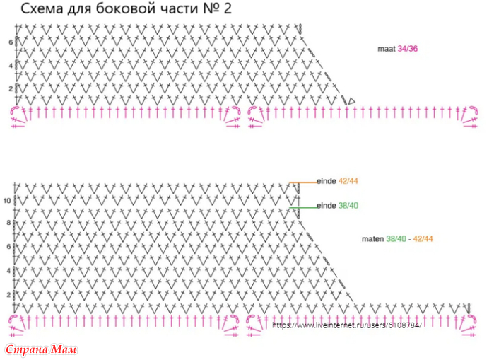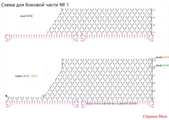 2. Боковая часть №1: По правому краю сшитых мотивов крючком №4 вяжите фантазийным узором (см. схему) указанное для вашего размера количество рядов: 1 - 1 - 2 - 2 ряда.