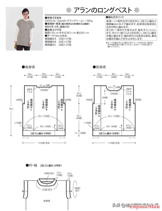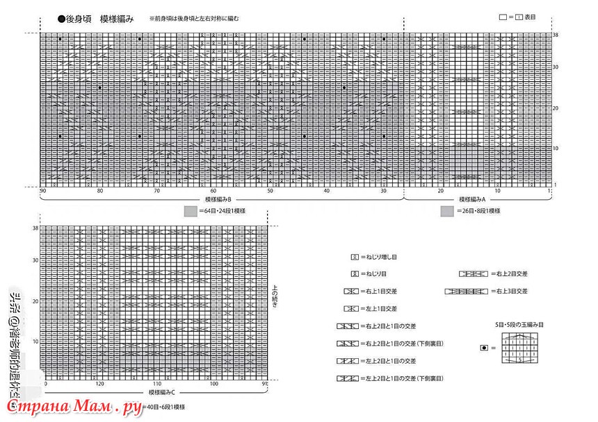 • Вяжите узорчатыми петлями A, B и C. Передняя часть изделия изготавливается из того же материала, что и задняя.