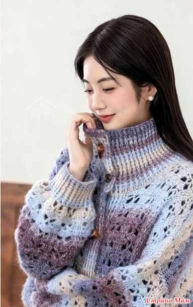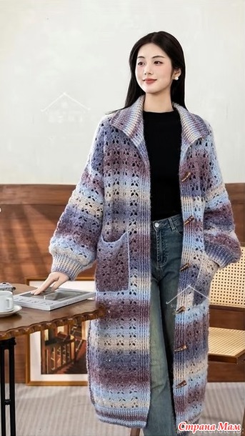 Длинное пальто из секционной пряжи с воротником стойка и накладными карманами. Крючок.