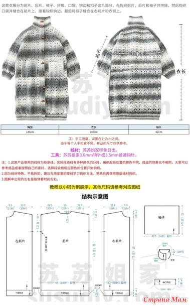 Это изделие состоит из нескольких частей: передняя часть, задняя часть, рукава, вставки, карманы, отделка и пуговицы. Сначала свяжите крючком переднюю часть, затем заднюю часть и рукава и соедините их. Далее свяжите крючком карманы и пришейте их к передней части. Затем свяжите крючком отделку. Наконец, пришейте пуговицы к правой передней части и воротнику.